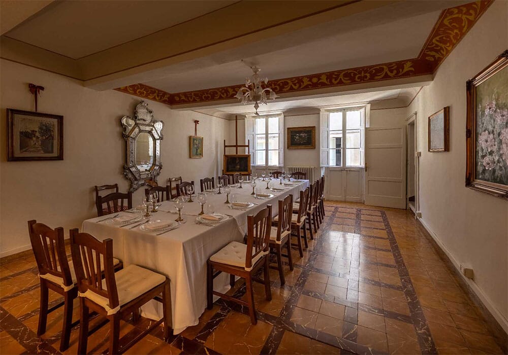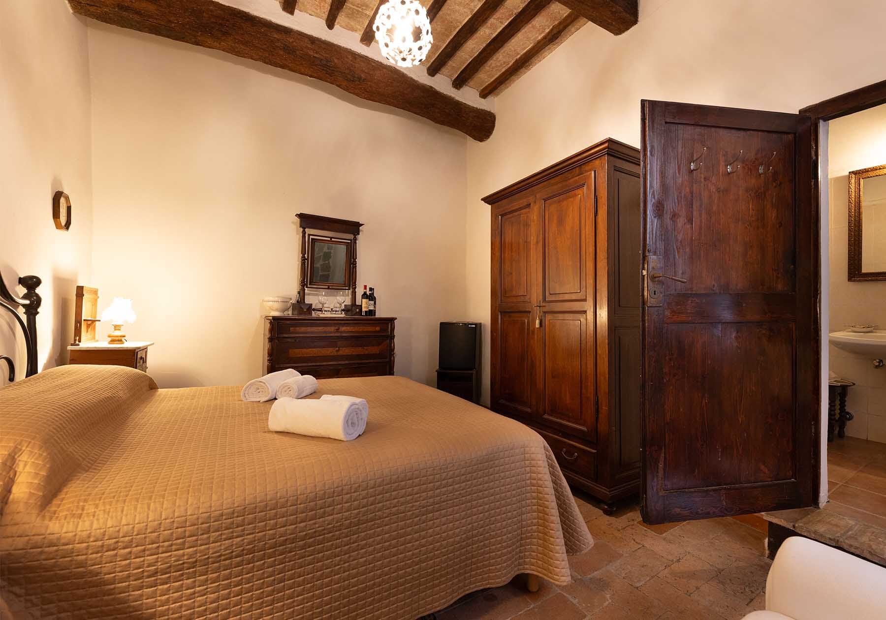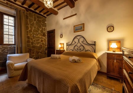 Immergiti nell'atmosfera unica della nostra camera matrimoniale al Palazzo del Cardinale. Con soffitto a travi in legno e mezzane e pavimento in cotto antico, letto in ferro battuto e parete in pietra a vista, questa spaziosa camera al piano terra offre un comfort senza pari. Il bagno privato e l'ampia disposizione rendono il soggiorno ancora più piacevole, con la praticità di trovarsi adiacente alla sala colazioni.