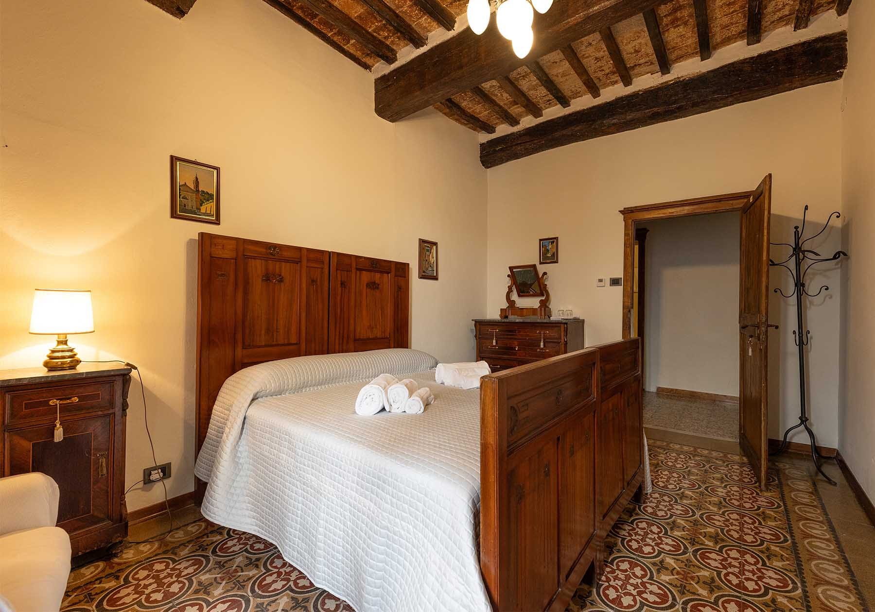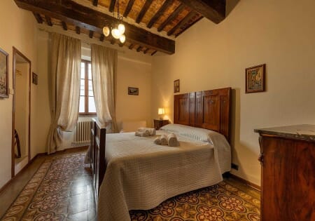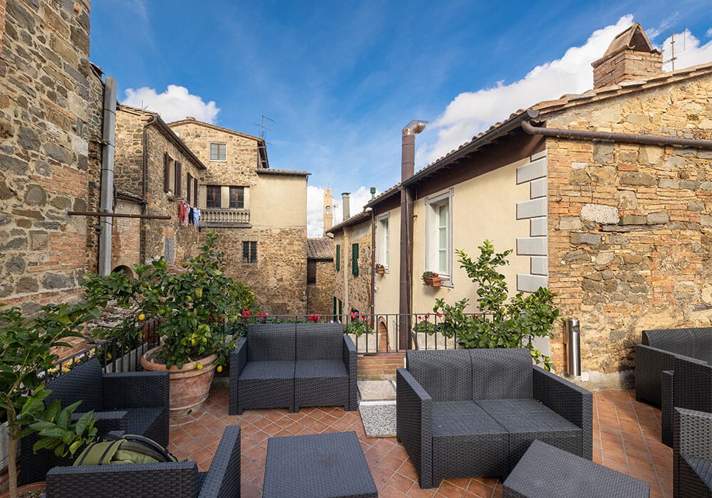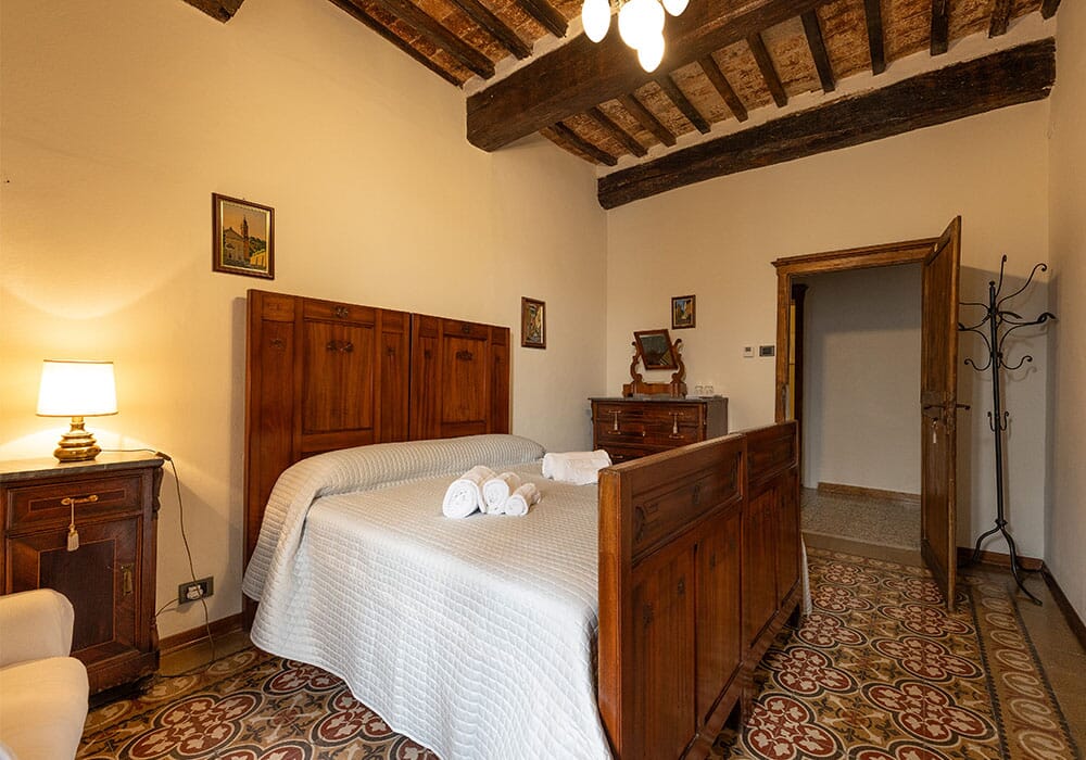 Situata al piano inferiore, scendendo verso il ristorante, questa ampia camera in stile toscano vanta un soffitto con travi in legno e mezzane in cotto, pavimento in graniglia decorata e un affaccio sulla via con vista sul campanile di Montalcino. La luminosità amplia l'atmosfera rilassante. Il bagno è esterno. Per le famiglie risulta essere particolarmente comodo in quanto i letti possono essere separati e, con la camera adiacente forma un vero e proprio appartamento con ingresso unico. Un connubio di eleganza e versatilità per un soggiorno indimenticabile.