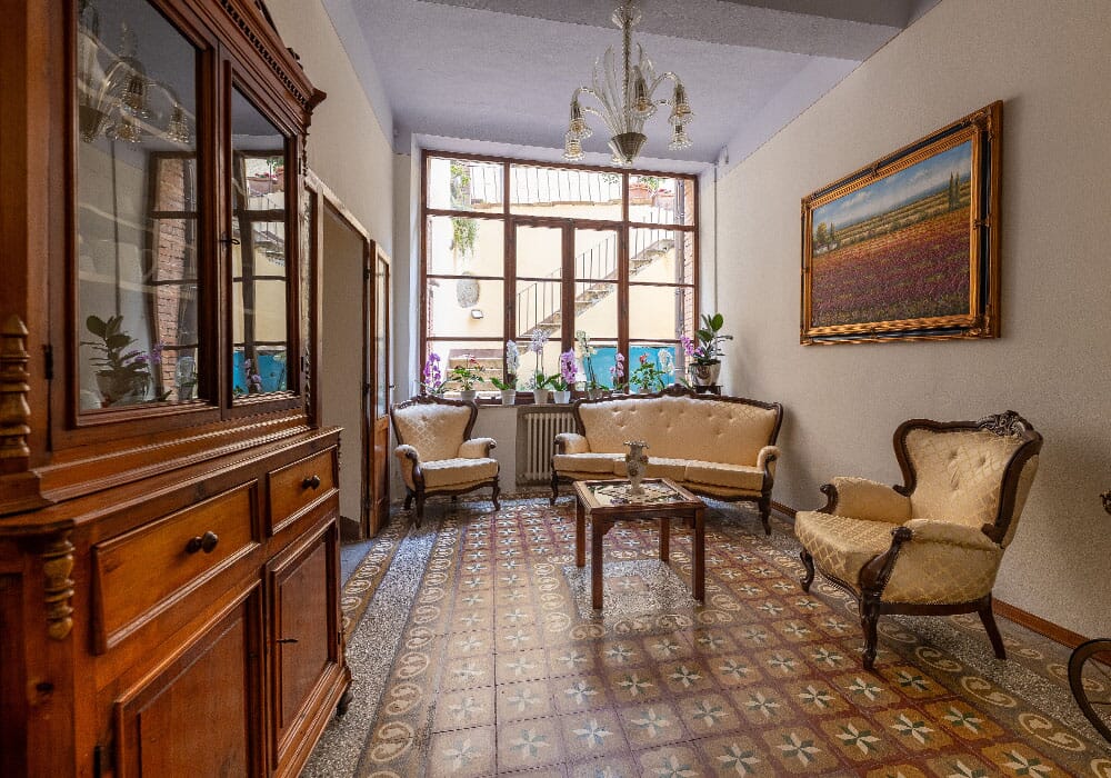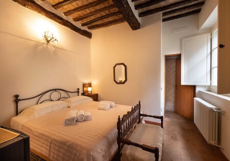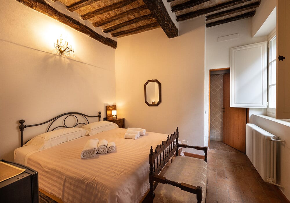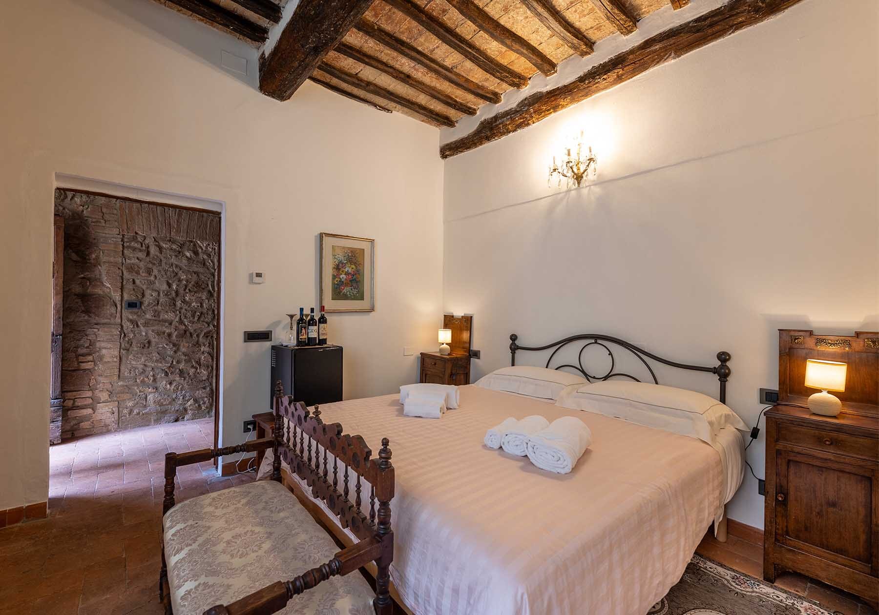 Lasciati avvolgere dal fascino della nostra camera matrimoniale al Palazzo del Cardinale. Con soffitto a travi in legno e mezzane, pavimento in antico cotto, letto in ferro battuto e bagno privato, questa spaziosa camera al piano terra offre comfort e raffinatezza. La sua posizione adiacente al cortile del palazzo la rende particolarmente comoda, consentendo un facile accesso sia alla sala colazioni che al ristorante.