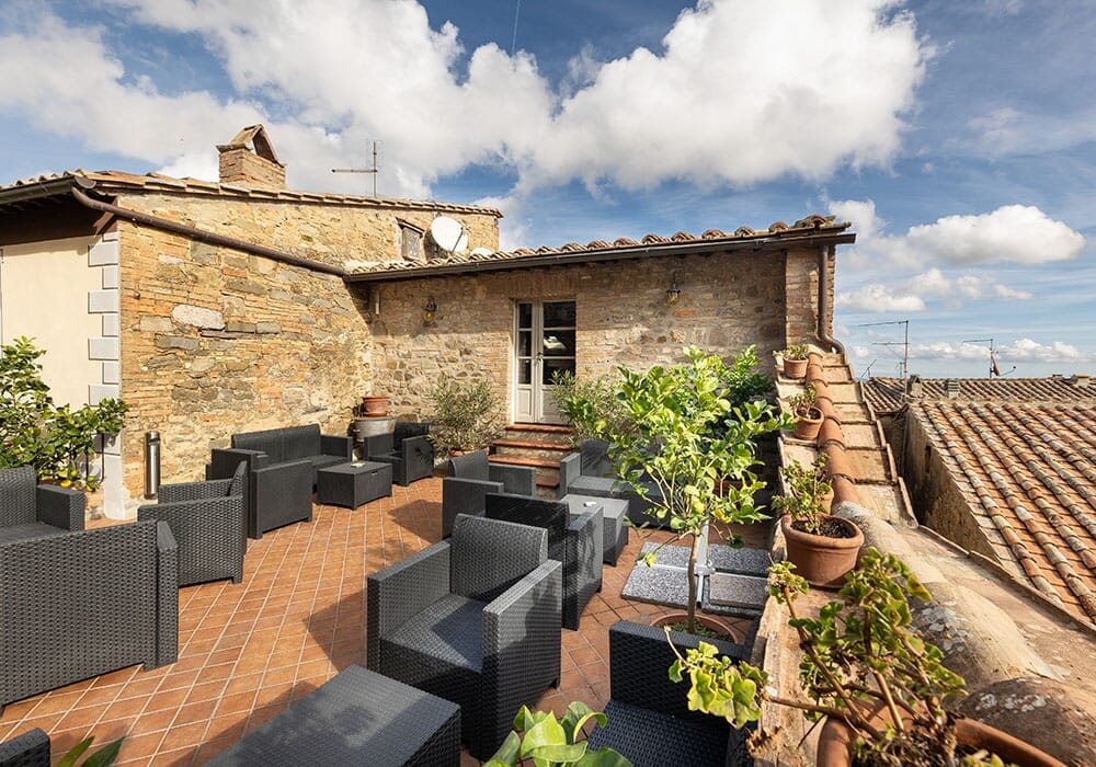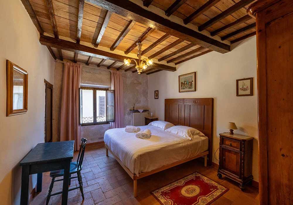Soffitto a travi di legno e mezzane in cotto incorniciano il vostro risveglio nella Camera Zebras, situata al primo piano del Palazzo del Cardinale. Il pavimento in cotto antico e l'arredo in stile barocco toscano creano un'atmosfera calda e accogliente, un tuffo nel fascino del passato.