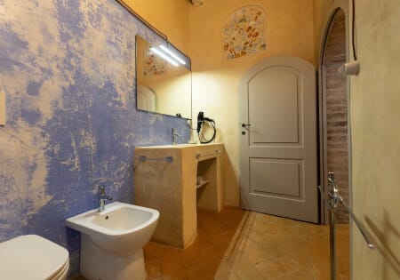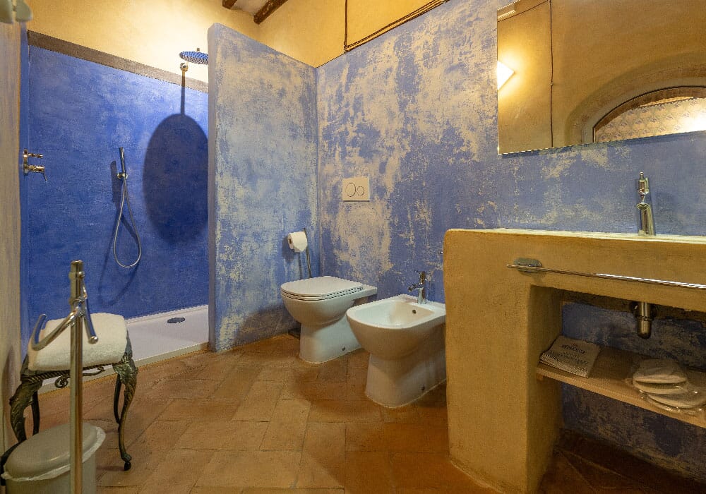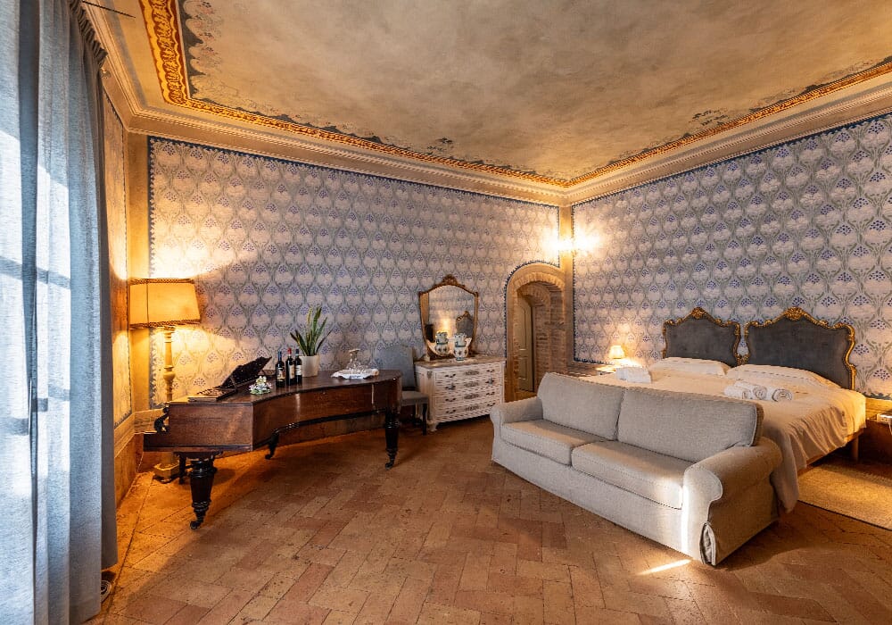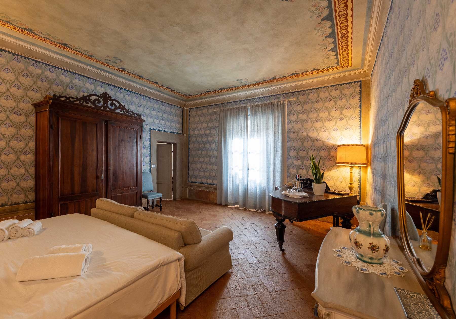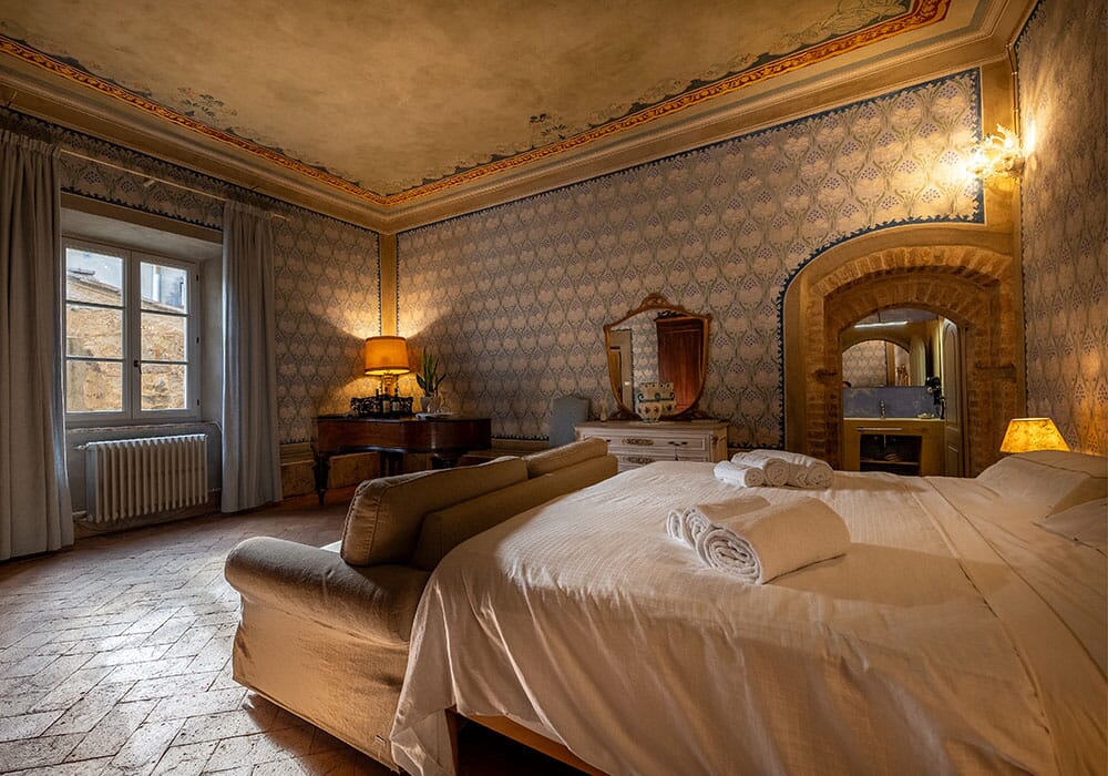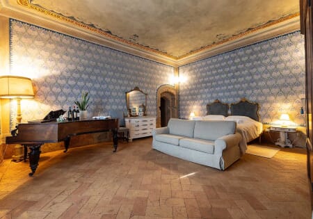 Esplorate il lusso rinascimentale nella nostra suite affrescata al Palazzo del Cardinale. Situata al primo piano, questa sontuosa camera offre un'esperienza visiva unica, con affreschi finemente dettagliati che adornano sia le pareti che il soffitto. Il pavimento in cotto d'epoca completa l'atmosfera storica. La suite vanta un bagno privato, un divano molto ampio e una luminosità avvolgente. Immergetevi nella ricchezza artistica e nel comfort di questa dimora d'epoca, creando ricordi indimenticabili a Montalcino.