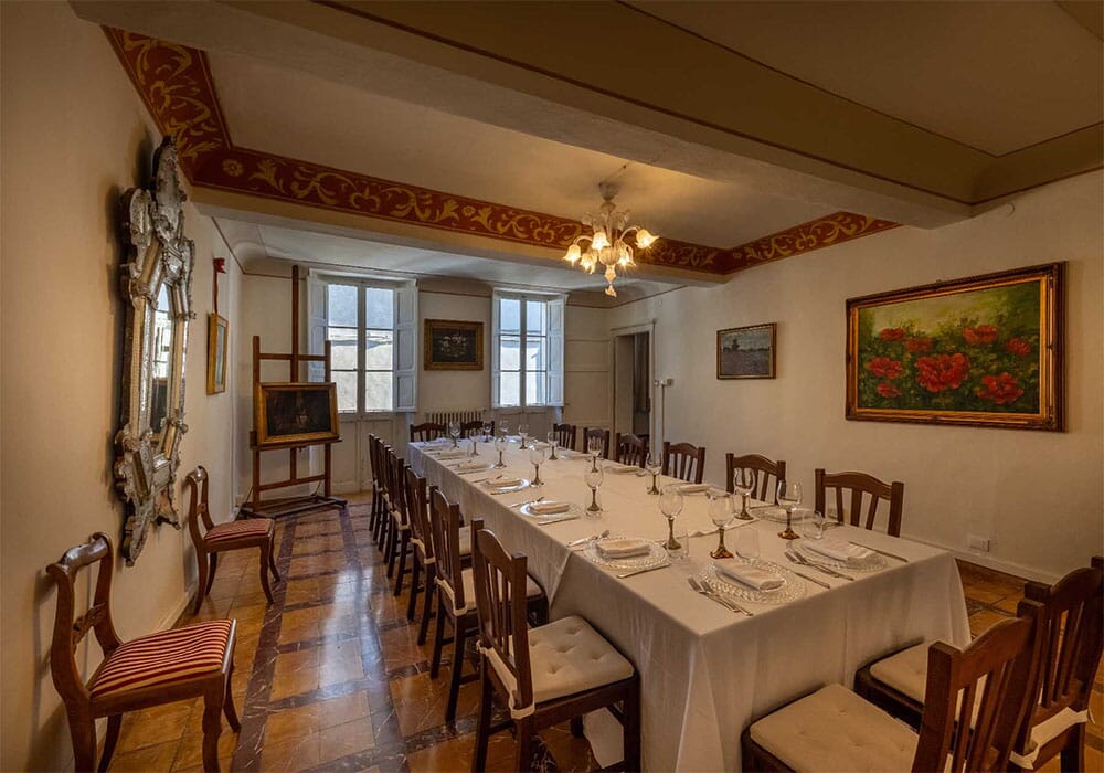 Ampi saloni affrescati ospitano varie aree condivise, tra cui la sala da pranzo cerimoniale, ricca di storia e eleganza.