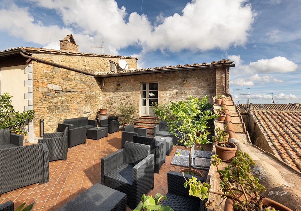 L'incantevole area relax del B&B Palazzo del Cardinale, sul suo terrazzo panoramico, regala una fuga serena nel cuore di Montalcino.